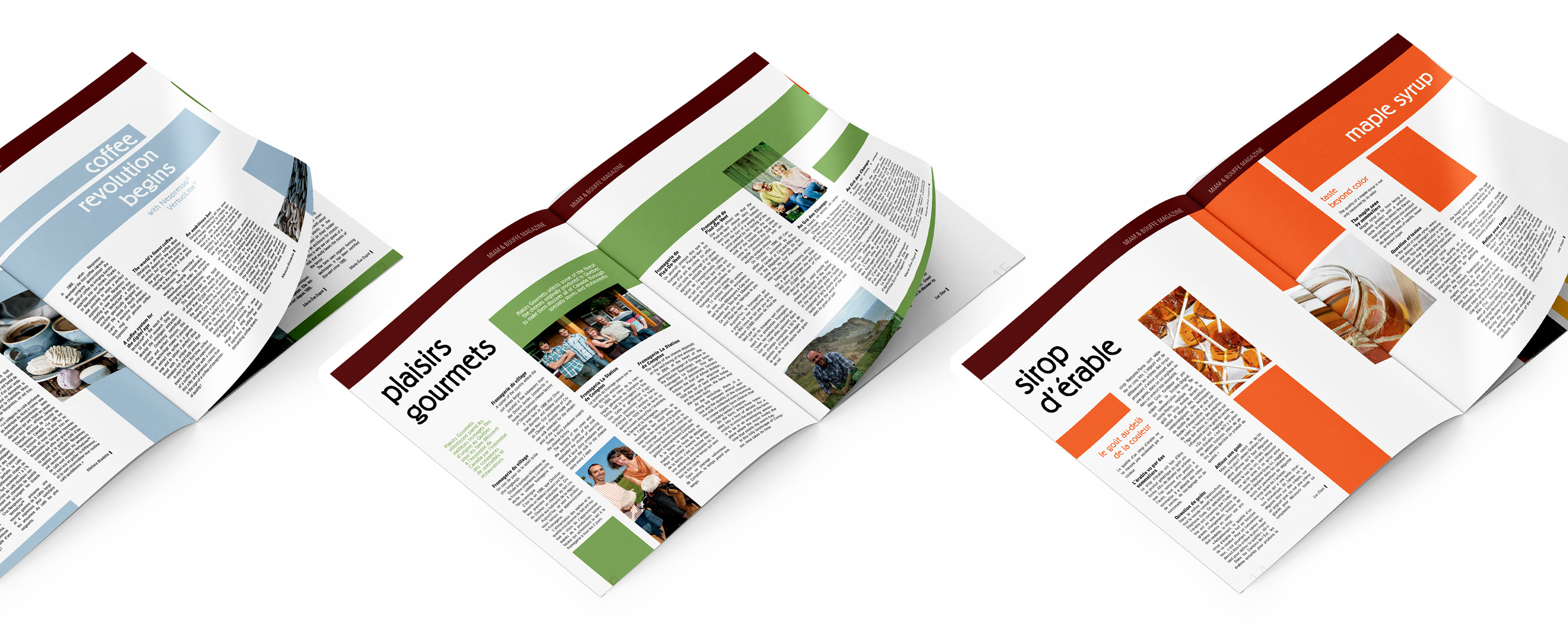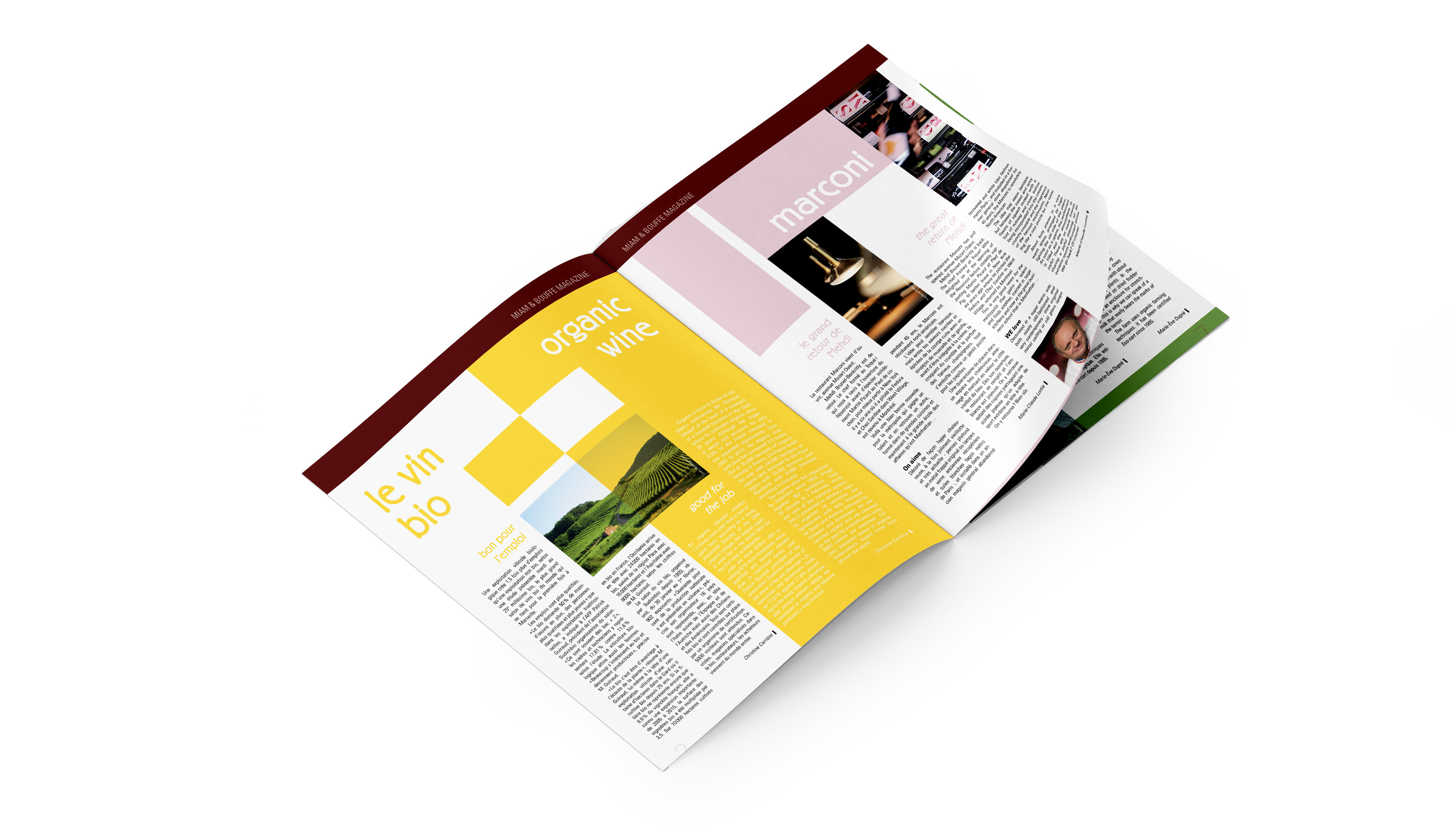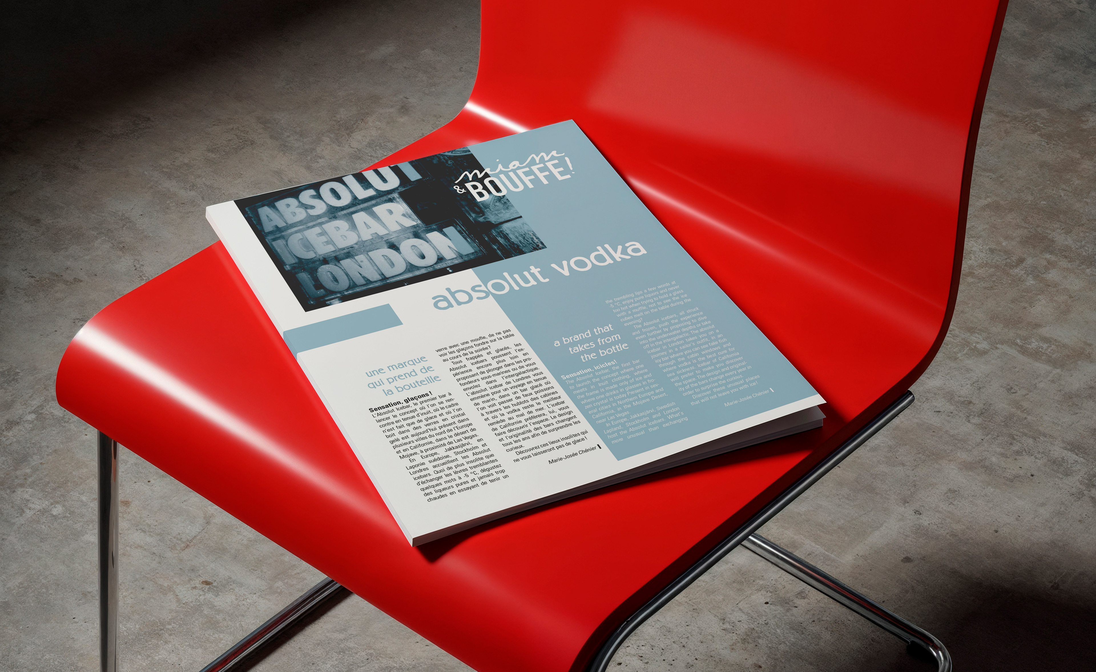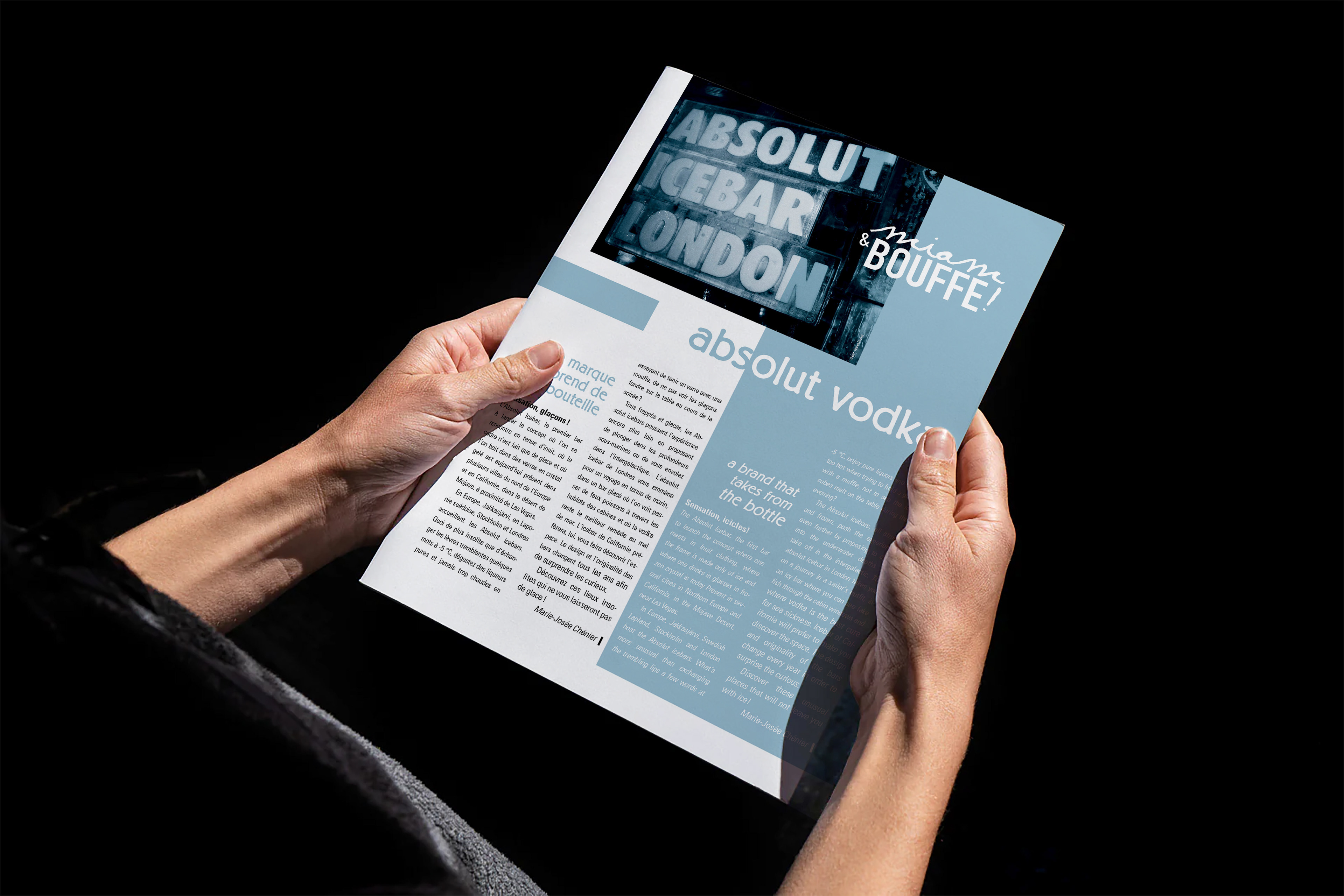 Un festin visuel pour les passionnés de food & beverage. Chaque rubrique de ce magazine de 16 pages se distingue par sa teinte et son traitement graphique. Jeux de couleurs, géométries en bloc, transparences. Le résultat : une mise en page vivante et rythmée, où chaque élément guide le lecteur à travers chaque découverte culinaire.